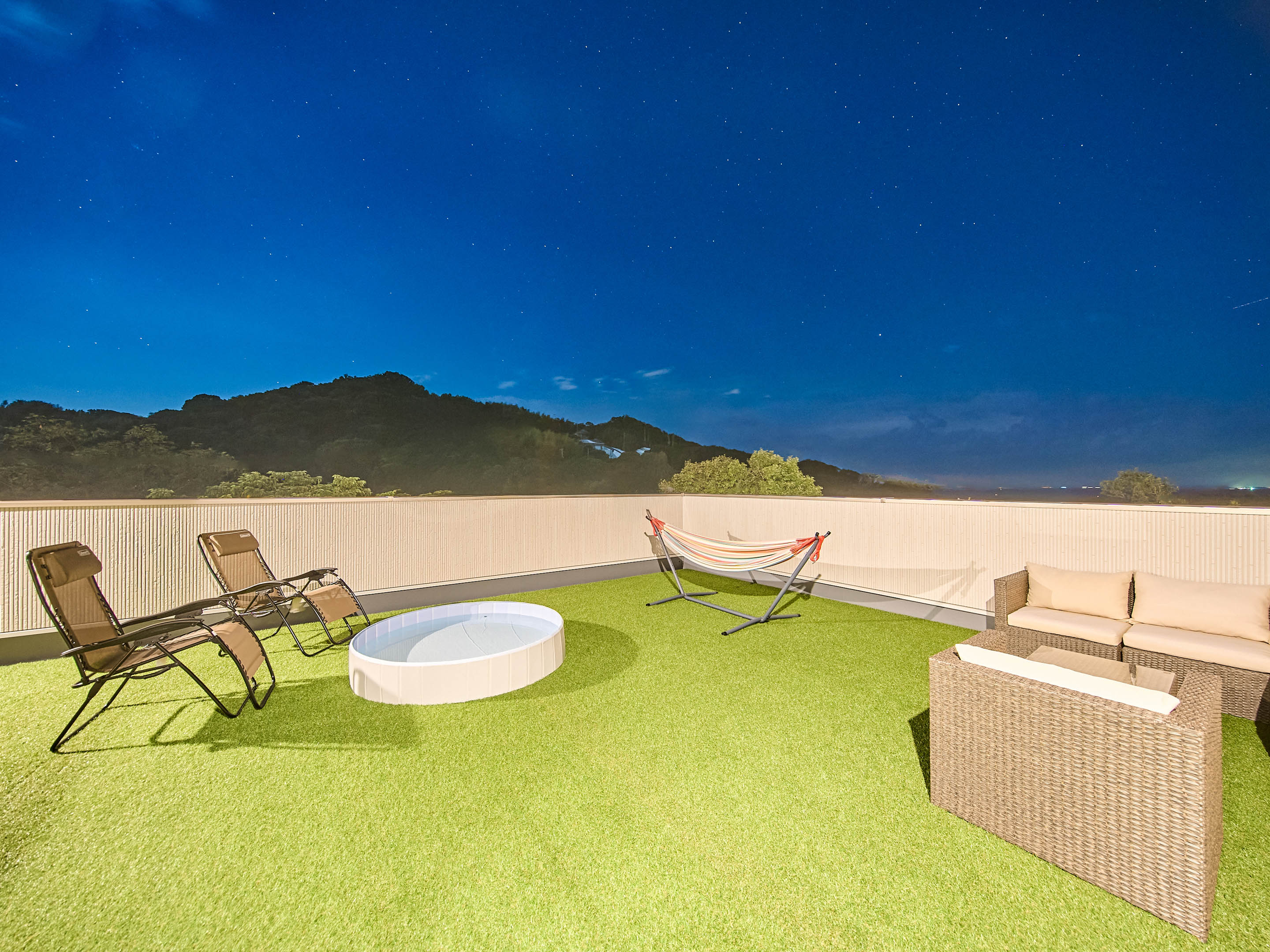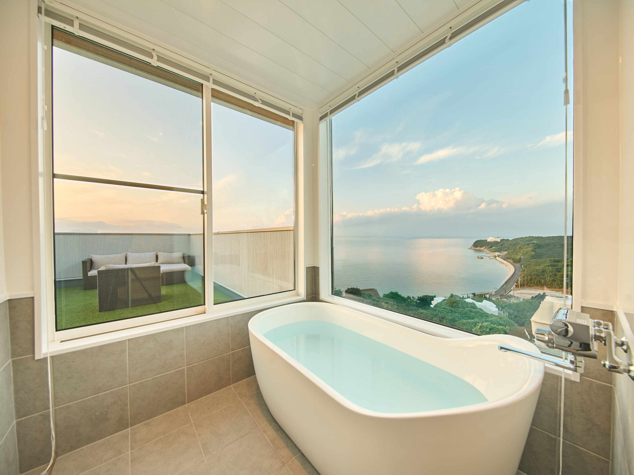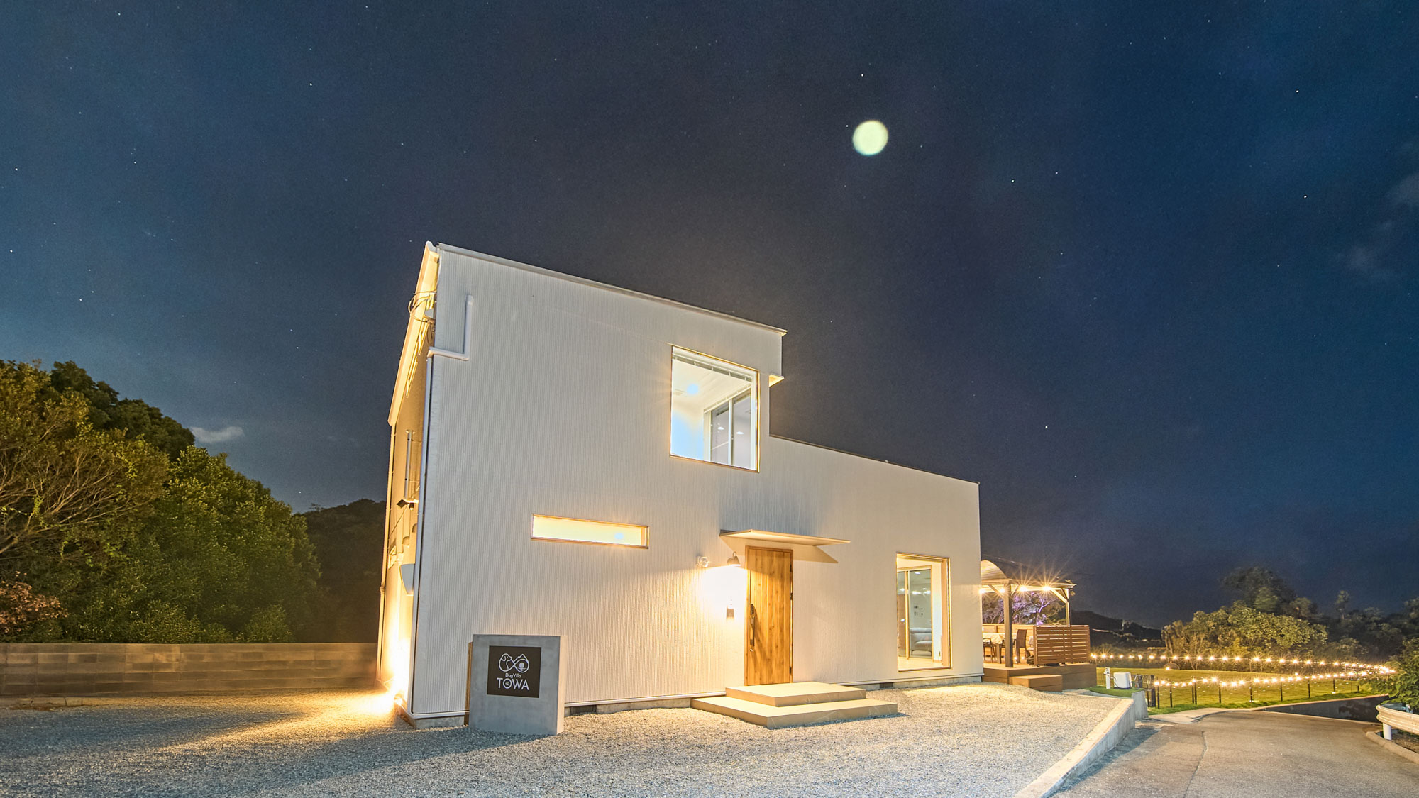 淡路島西海岸の高台に佇む、TOWA。瀬戸内海を一望する180°の絶景が広がります。絵に描いたような海、やわらかな風、移ろいゆく空の色、目の前に広がる風景が、日常の疲れをやさしく解きほぐしてくれます。夕暮れどきには、海の向こうに真っ赤な夕日が沈み、夜には、空いっぱいに天然のプラネタリウムが広がります。