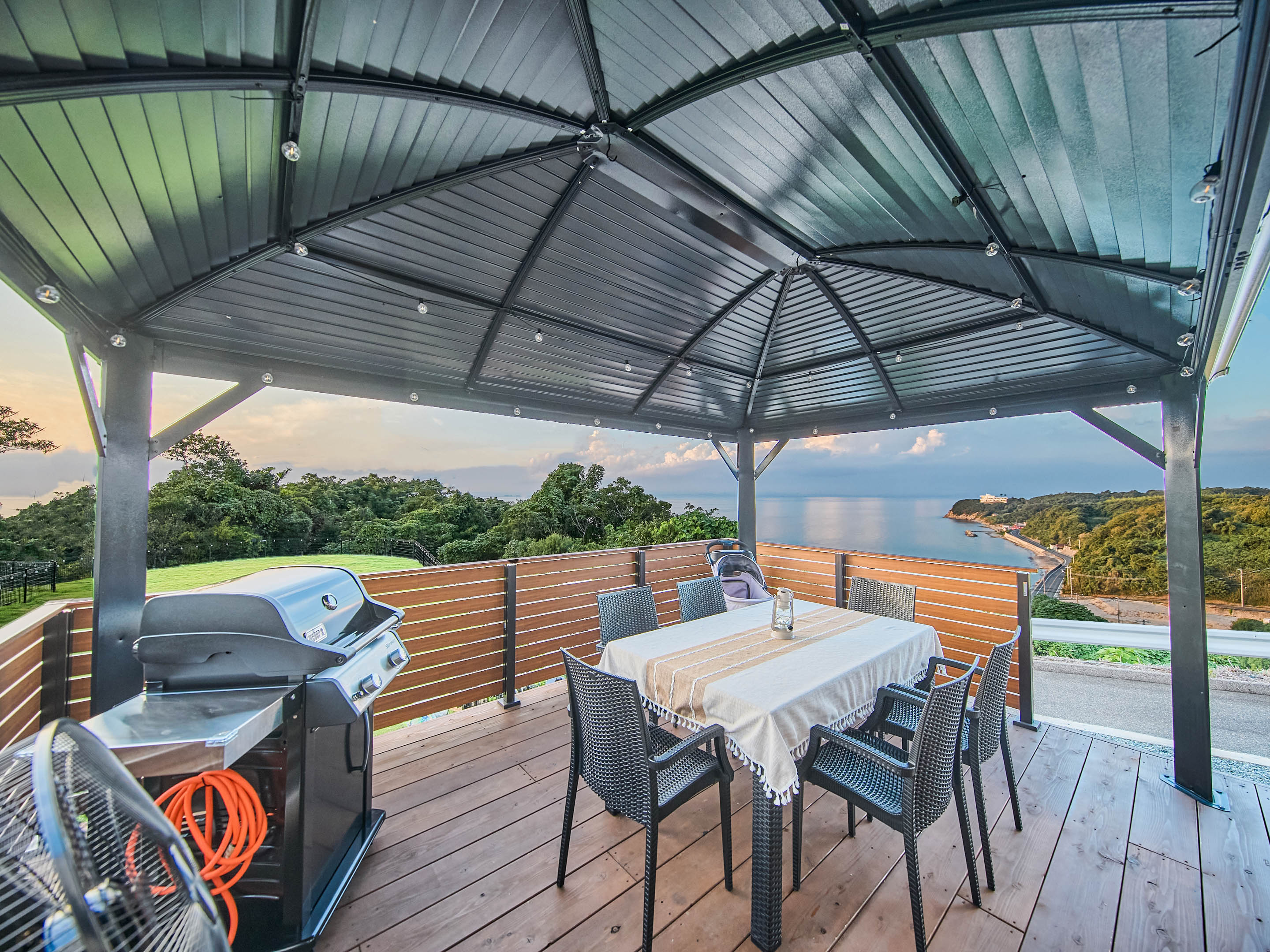 屋根付きのBBQスペースで多少の雨でも安心!夕日を眺めながらBBQをお楽しみください。 Weber社製のBBQガスグリルをご用意しております。20:00
